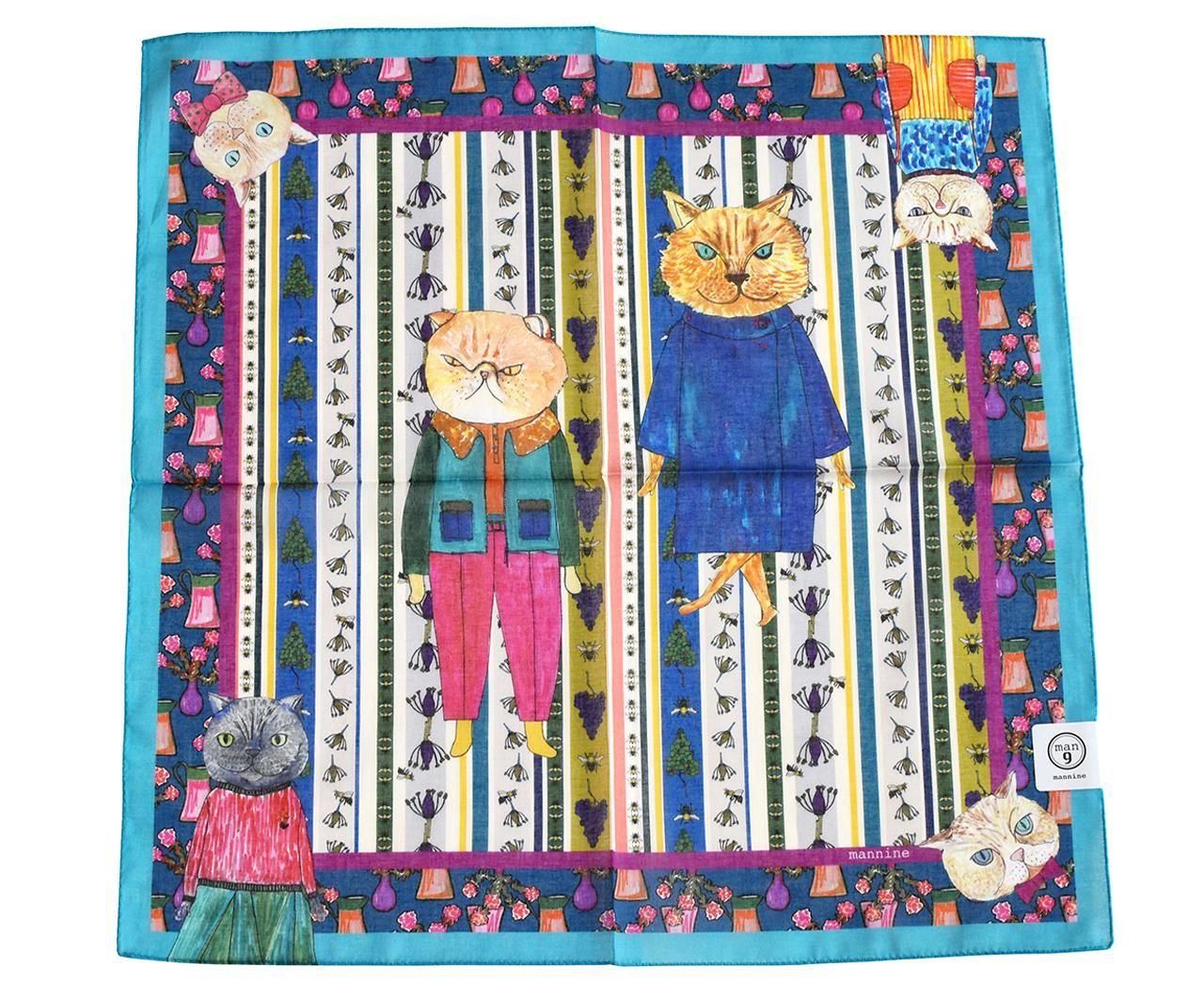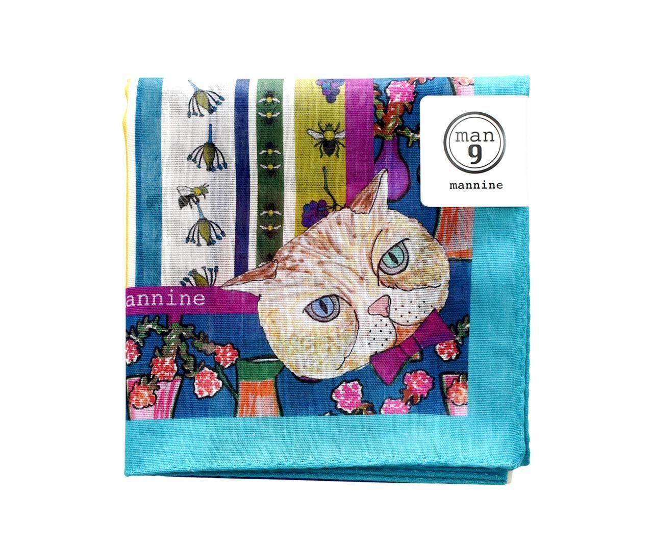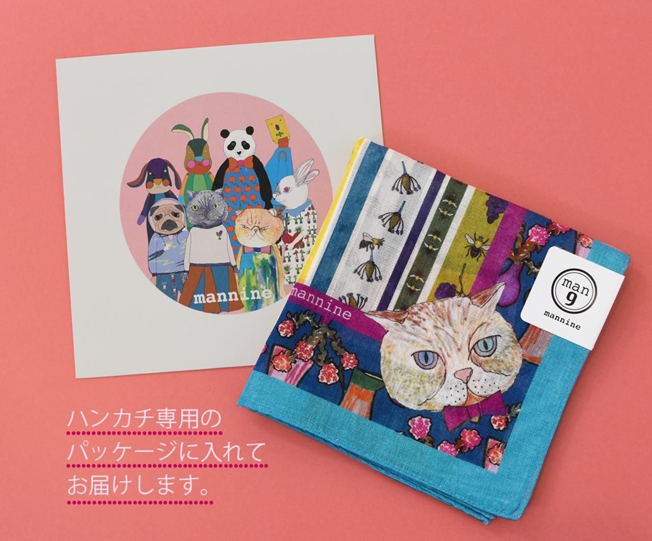 中央と四隅にはマンナインの猫キャラクターたちがプリントされています。